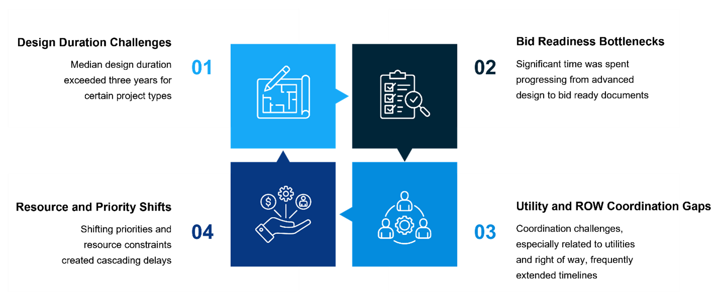 While delays were often most visible between bid and construction start, a deeper look revealed that many of the root causes originated earlier – during design, coordination, and project readiness.